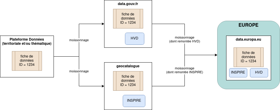 Les données sont moissonnées par data.europa.eu pour proposer un catalogue européen des données de forte valeur.