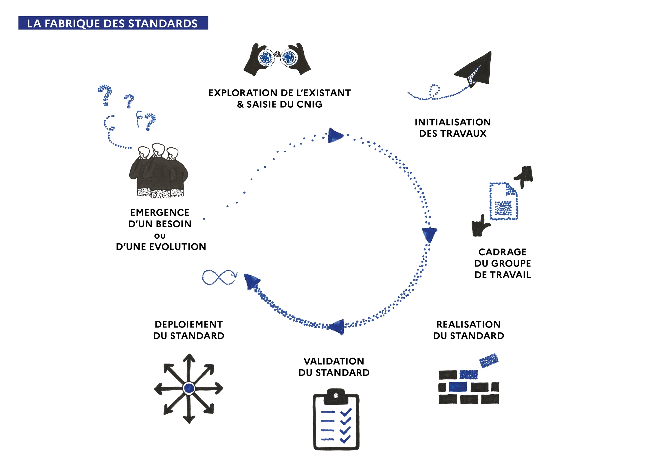 La fabrique des standards désigne le processus de création d'un standard CNIG avec ses différentes phases et la documentation associée à destination des différents acteurs de l'élaboration d'un standard (pilotes, animateurs ou participants aux GT). Elle est documentée dans ce guide.