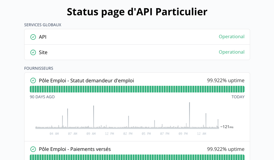La disponibilité de l'API Particulier est accessible à cette page : https://status.particulier.api.gouv.fr/